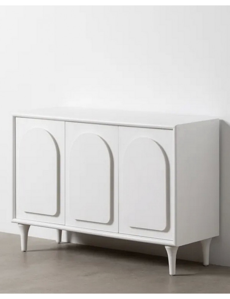 Este no es un simple mueble blanco. Su carácter reside en las tres puertas decoradas con paneles en forma de arco, una tendencia decorativa en auge que aporta dinamismo, profundidad y un aire sofisticado sin recargar el ambiente.